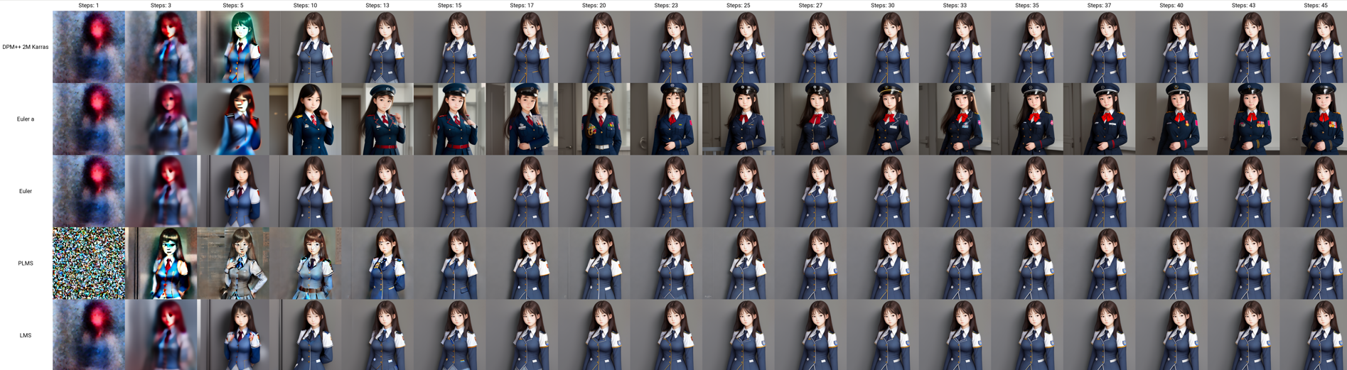 如上图所示,如果一个采样方式后面带有a的,参考Euler a,表示生成出来的人物动作会发散,在不同迭代步数的效果图下,人物的动作会有变化;