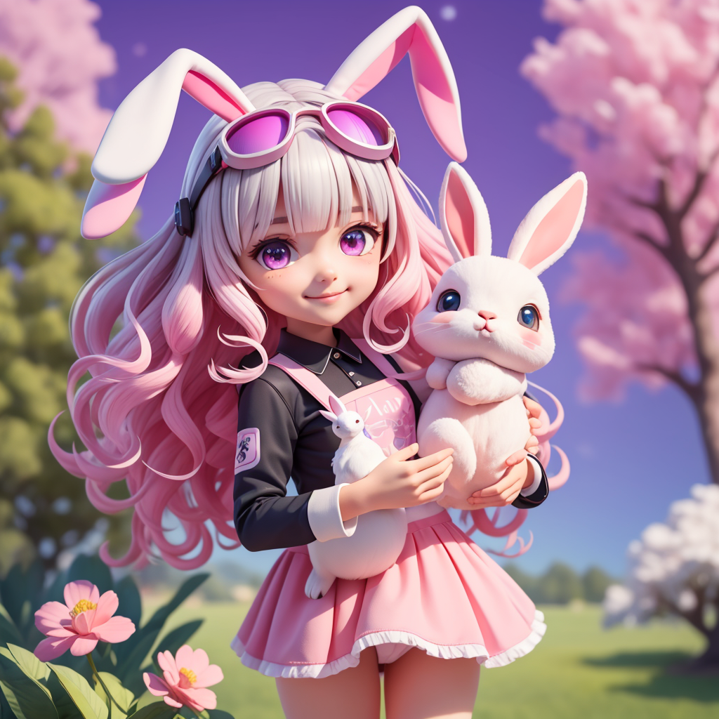 (masterpiece),(best quality),(ultra-detailed), (full body:1.2), 1girl,chibi,cute, smile, outdoors, tree, :3, shirt, (Silver white curly hair), pink helmet with feathers, transparent goggles, black shirt, pink coat, pink short skirt, Holding a rabbit doll in hand, (pout), (Rabbit ear), pink and purple night sky, blurry, bangs, (beautiful detailed face), (beautiful detailed eyes),<lora:blindbox_v1_mix(盲盒效果):1>