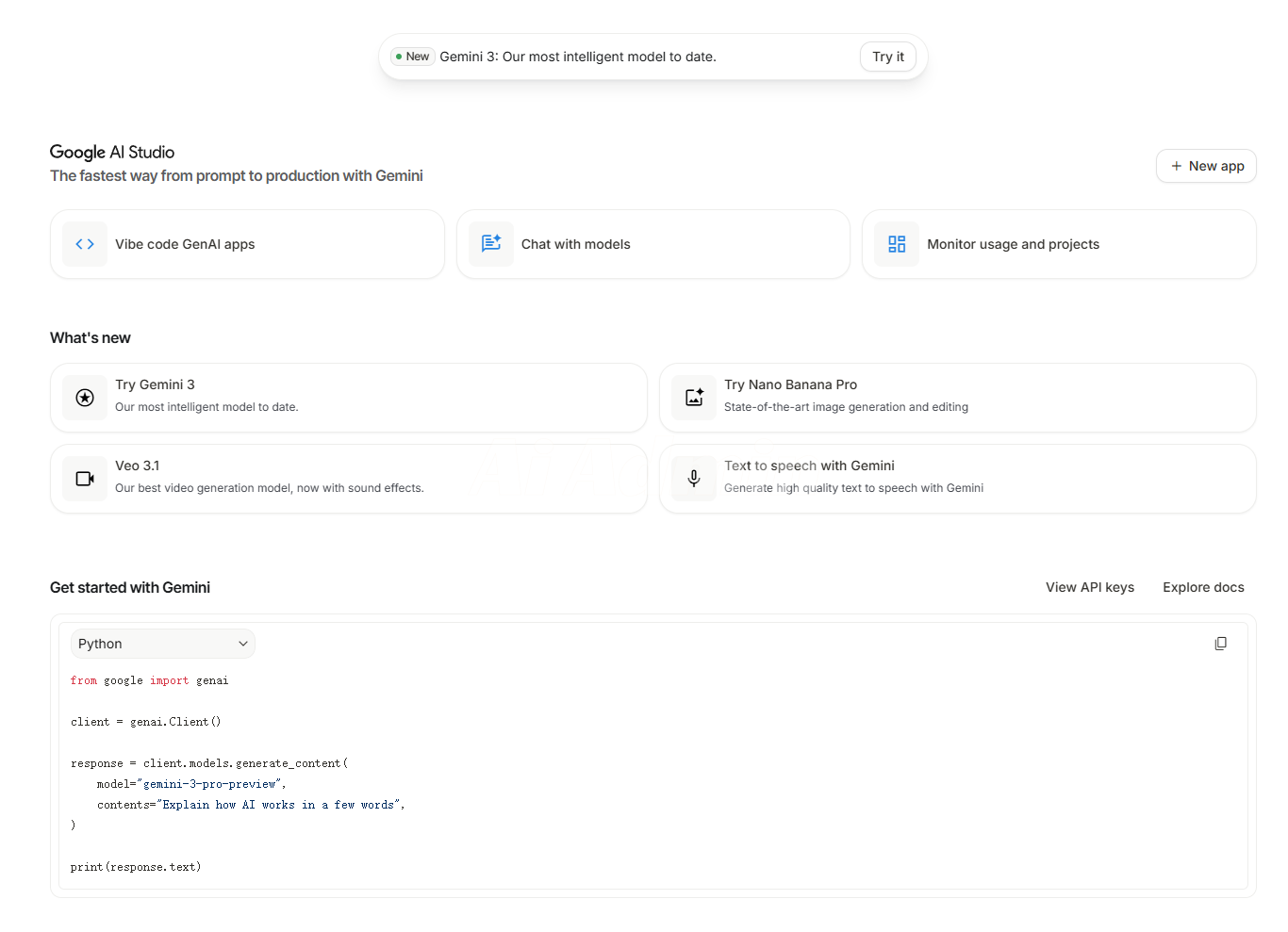 Google AI Studio 是由 Google 推出的一款基于浏览器的综合 AI 开发与创作平台。它集成了 Google 的生成式 AI 模型(如 Gemini 系列模型)与多模态能力,用户不仅可以通过文字对话与 AI 交流,还可以生成或编辑图像、音频、视频,快速原型开发 AI 应用。对开发者、内容创作者和普通用户都非常友好,无需复杂编程即可使用。
