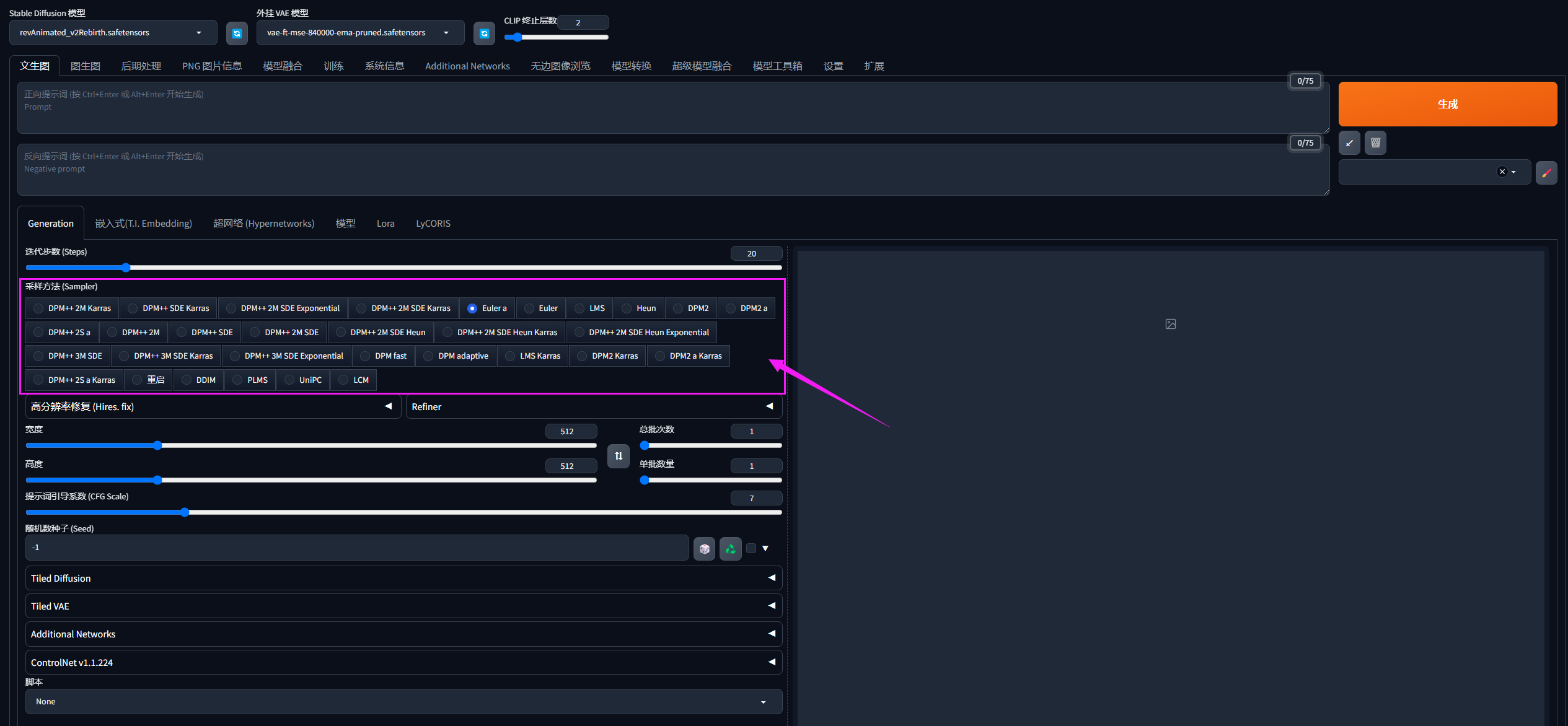 打开SD绘画界面,如下图所示,即采样方法的设置区域。