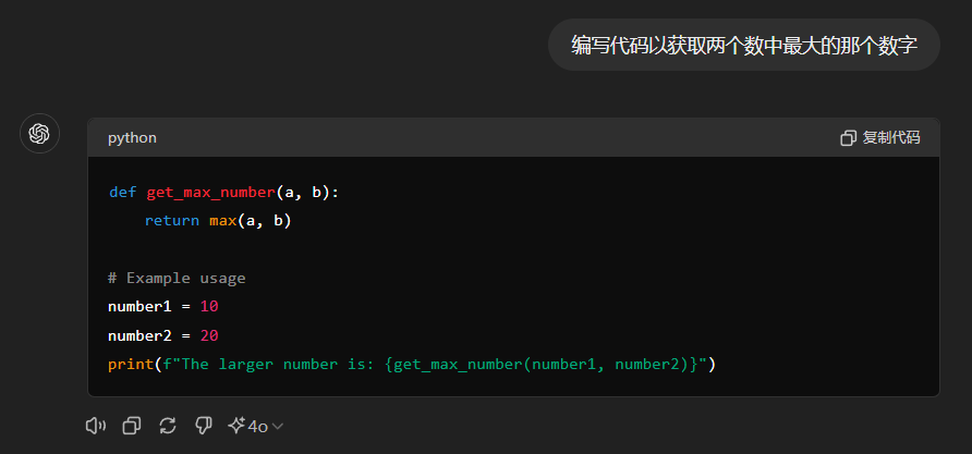 然后你可以问ChatGPT:“编写代码以获取两个数中最大的那个数字”。ChatGPT就根据你设置好的指令,就会直接给你生成一串代码,而没有进行过多的解释。