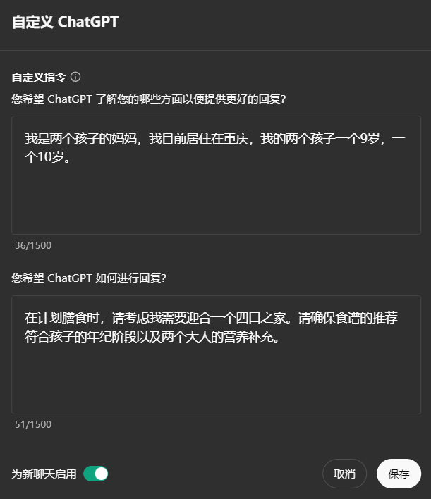 例如,你是一个教三年级语文的老师,你需要用ChatGPT来给你生成教案,那你只需要把你三年级语文老师、教案的内容要求、输出格式要求等一些重复的标准和信息设置为自定义指令,那后续你只需要专注于每次教案的主题即可,ChatGPT就会根据你设置好的规则输出你想要的回答方式、内容和风格。
