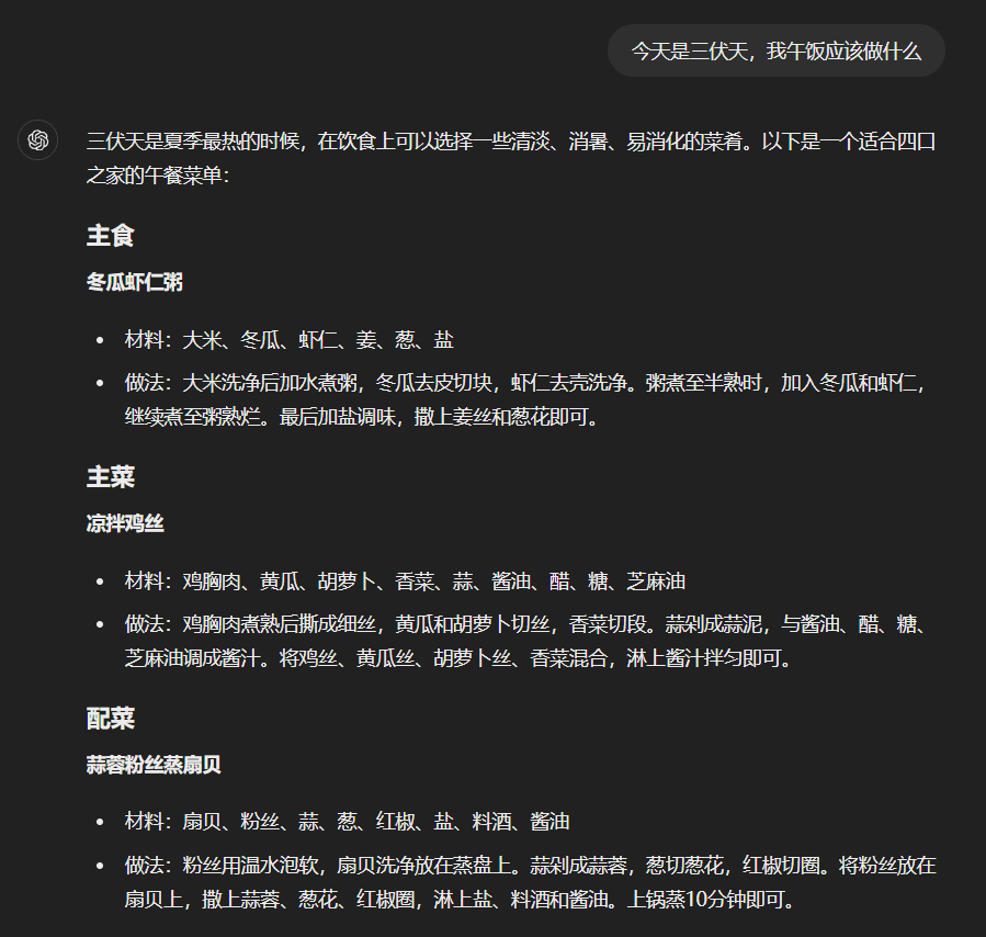 然后你可以问ChatGPT:“今天是三伏天,我午饭应该做什么”。ChatGPT就会充分考虑你设置好的指令,进行回答。